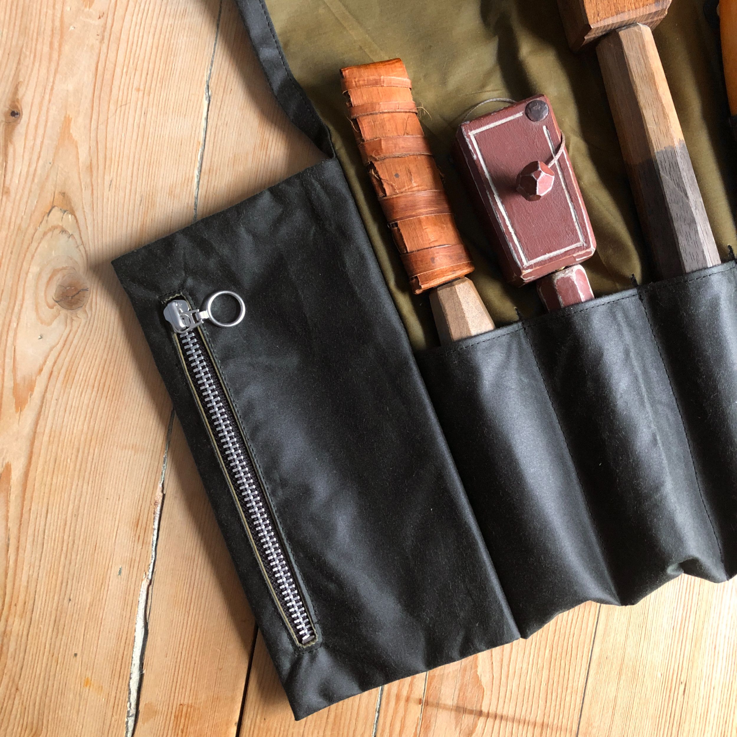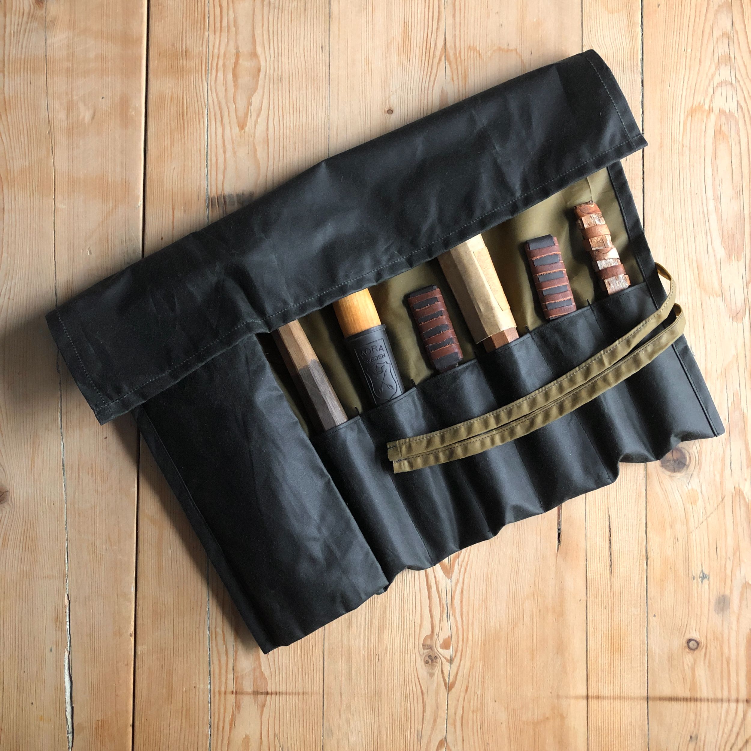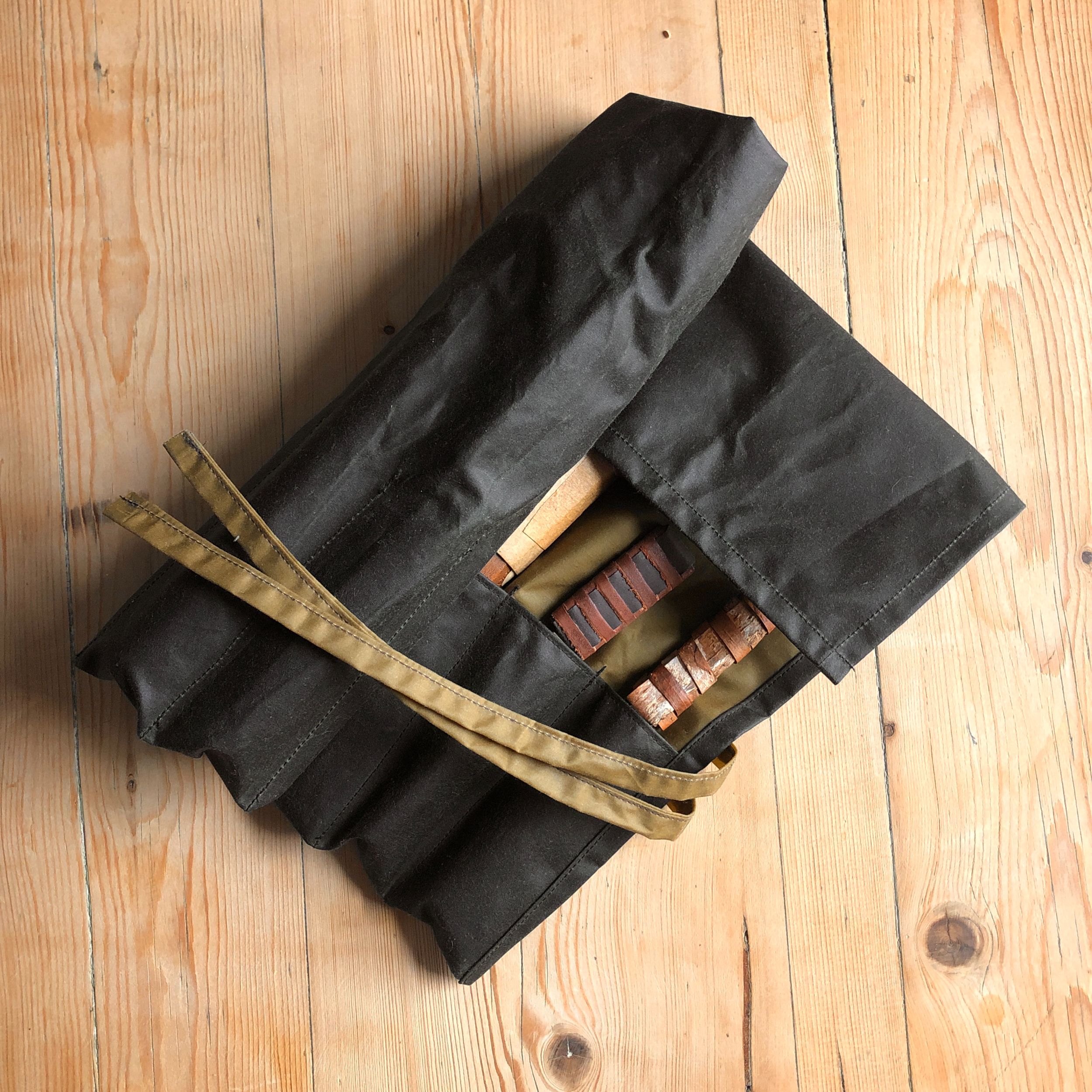 This tool roll is made from a black waxed canvas with a khaki brown waxed cotton lining. As the fabric is waxed it shouldn’t be put in the washing machine, but it is resistant to water and staining.