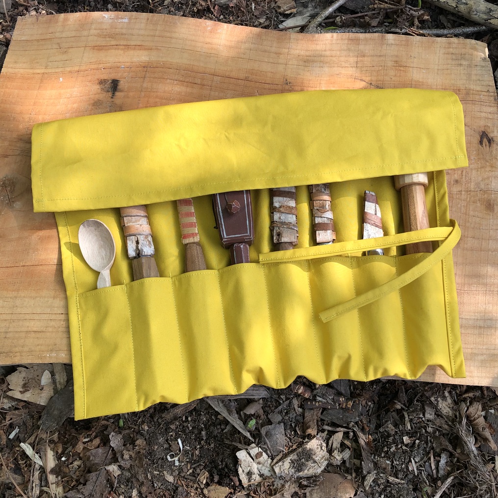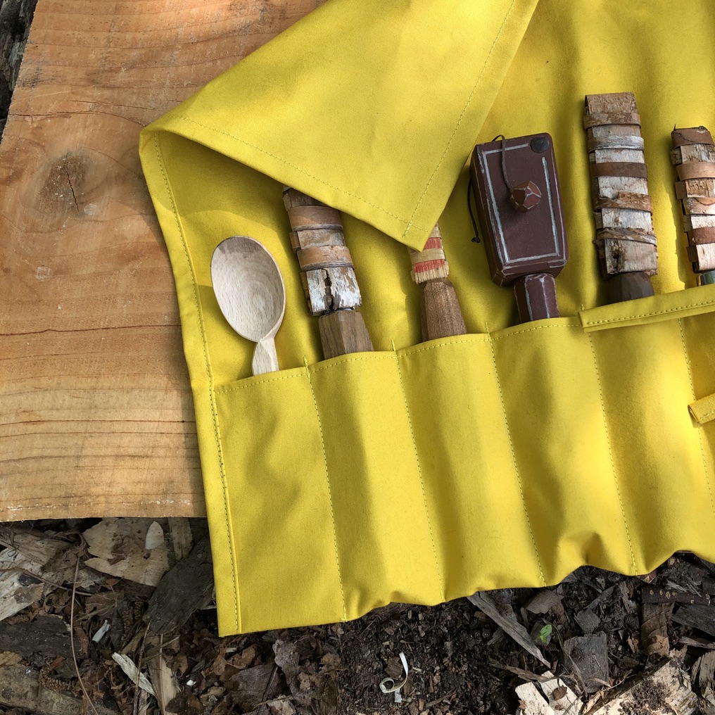 This tool roll is made from a bright yellow heavy cotton. This fabric has a waterproof coating on the inside so although it has a soft cotton feel, it should keep anything inside it dry. It is best not to machine wash it to preserve this coating, however feel free to experiment as you see fit with washing!