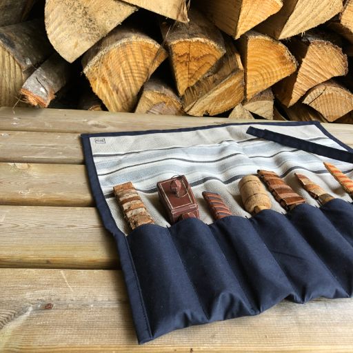 This tool roll is made from a waxed navy cotton with a heavy cotton striped lining, made from deadstock furnishing fabric. As the fabric is waxed it shouldn’t be put in the washing machine, but it is resistant to water and staining.