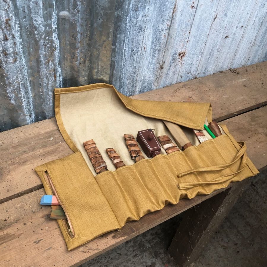 This tool roll is made from a waxed navy cotton with a blue and white striped cotton lining. As the fabric is waxed it shouldn’t be put in the washing machine, but it is resistant to water and staining.