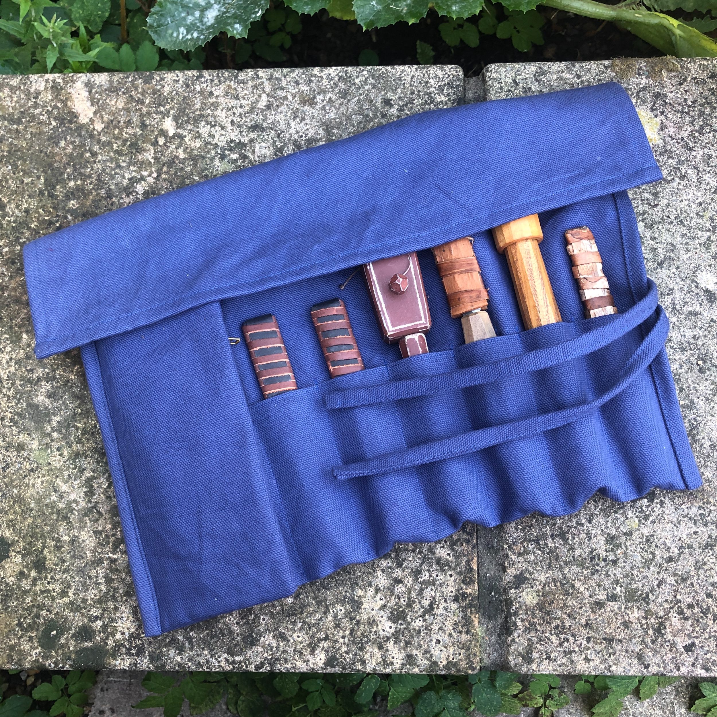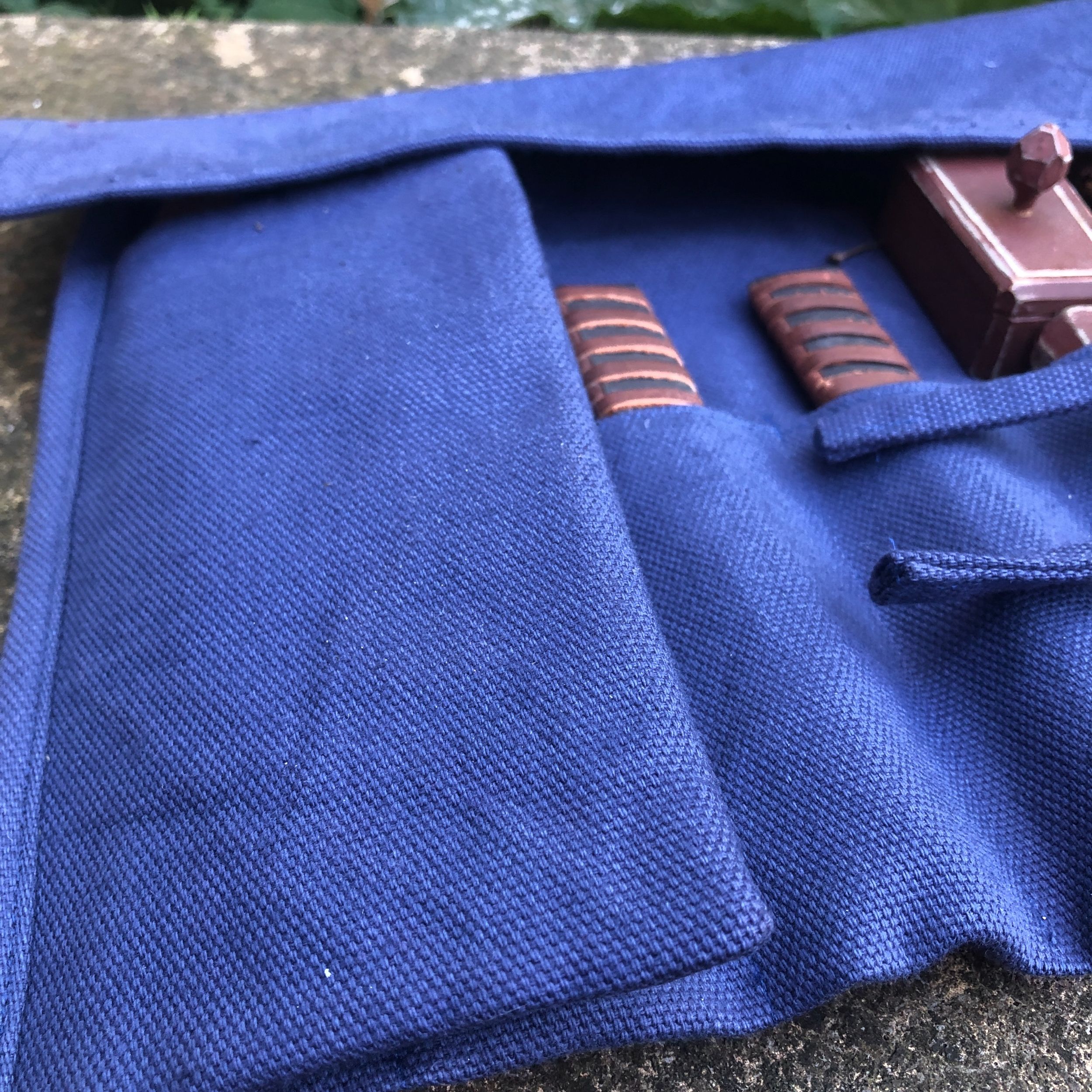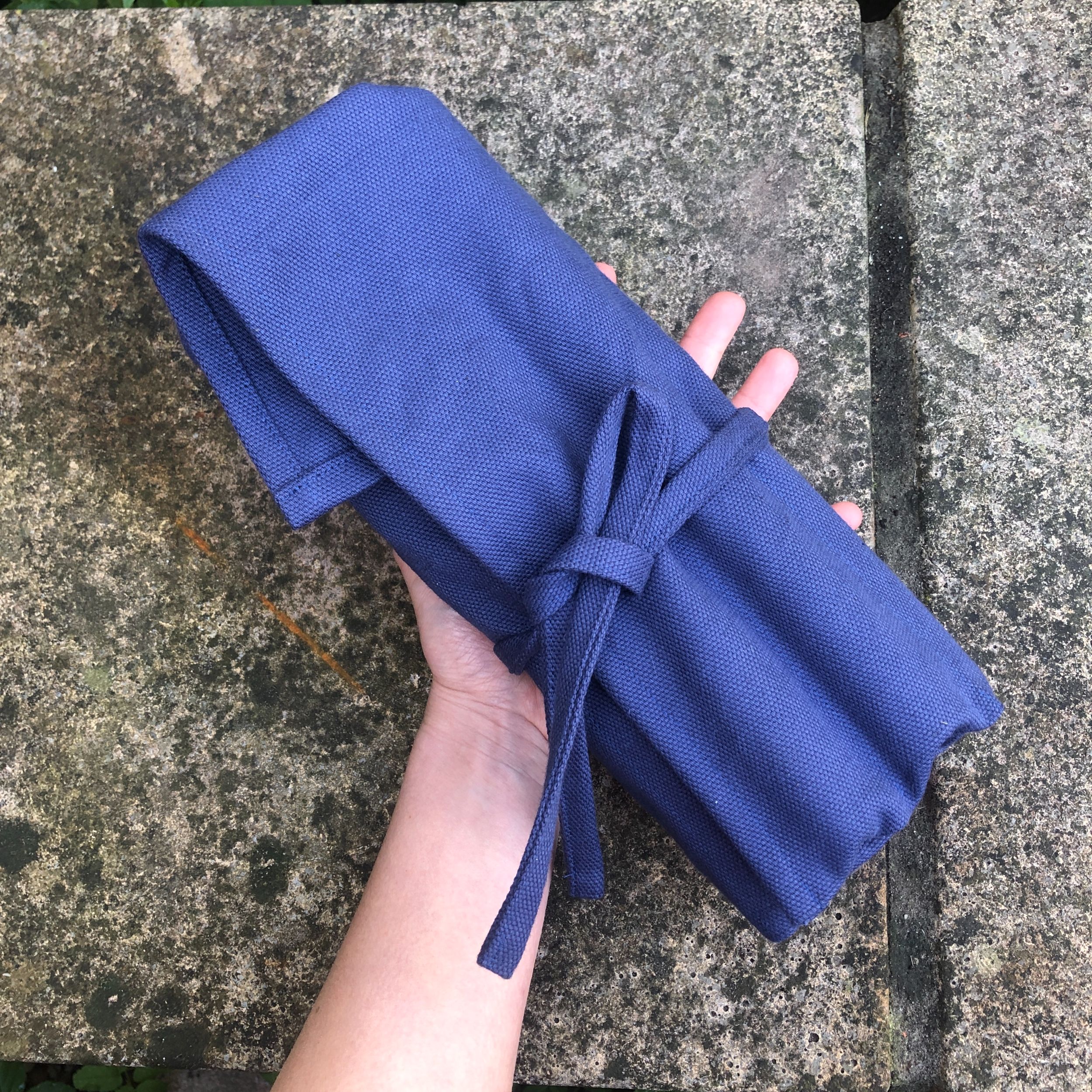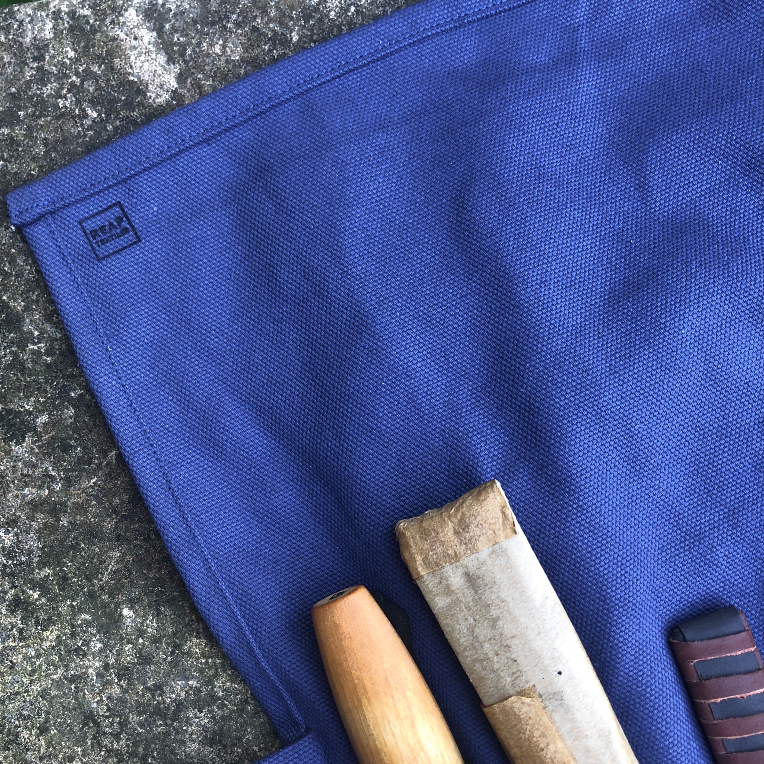This tool roll is made from a heavy royal blue cotton canvas. It is machine washable.