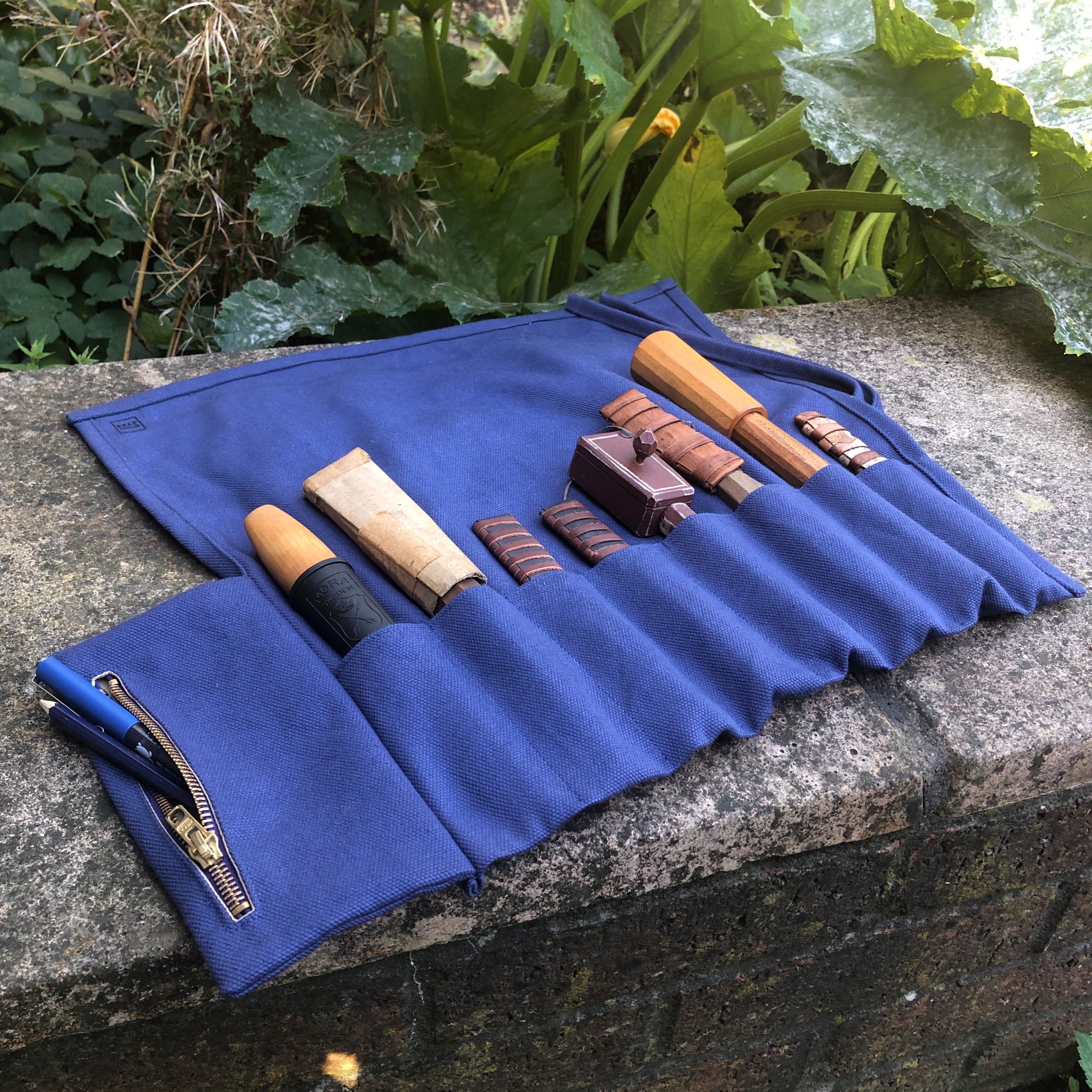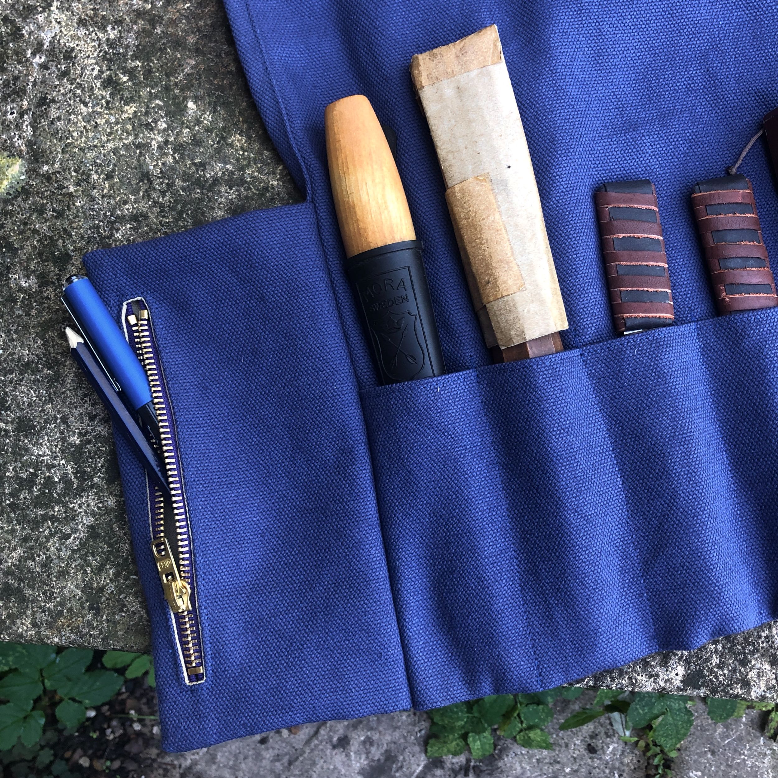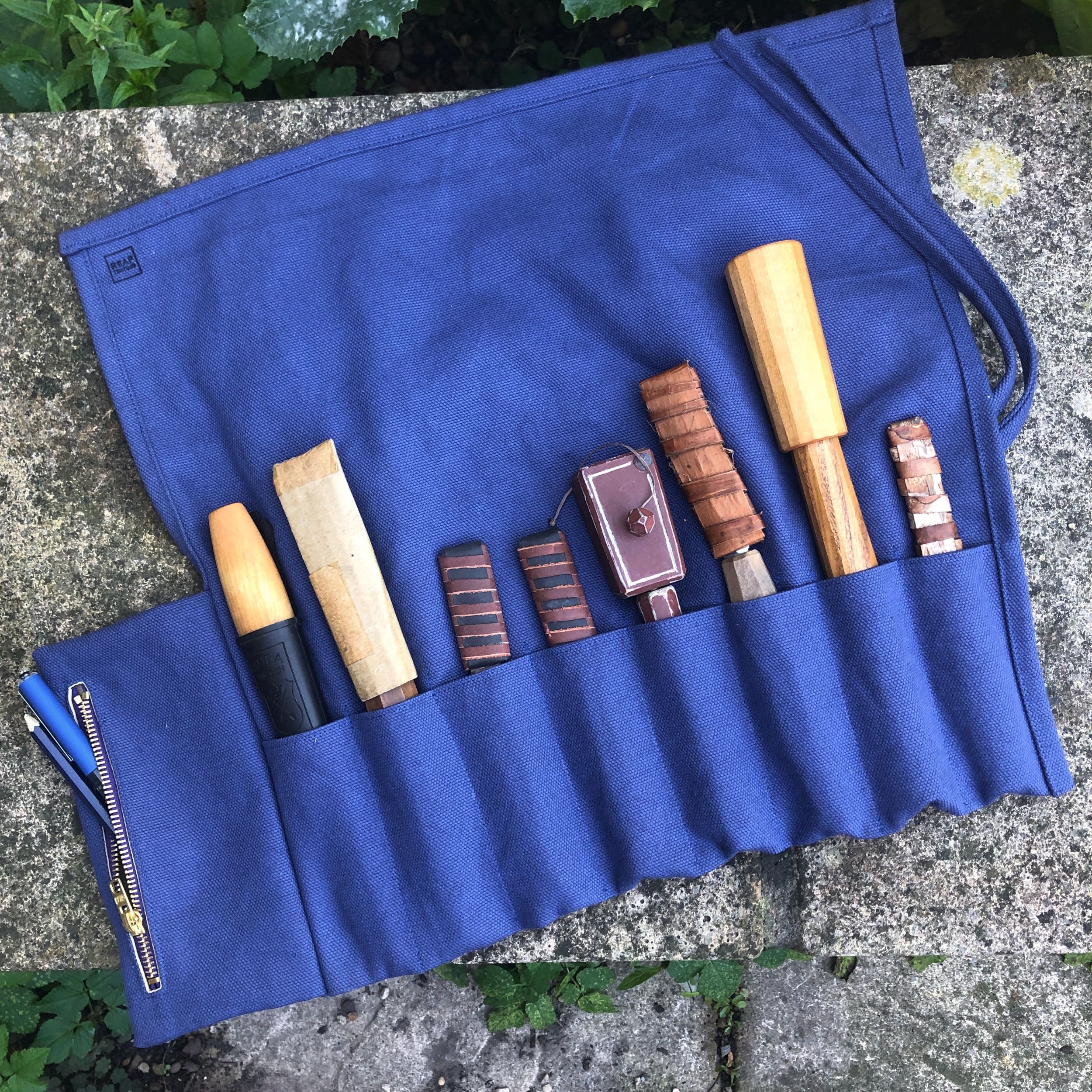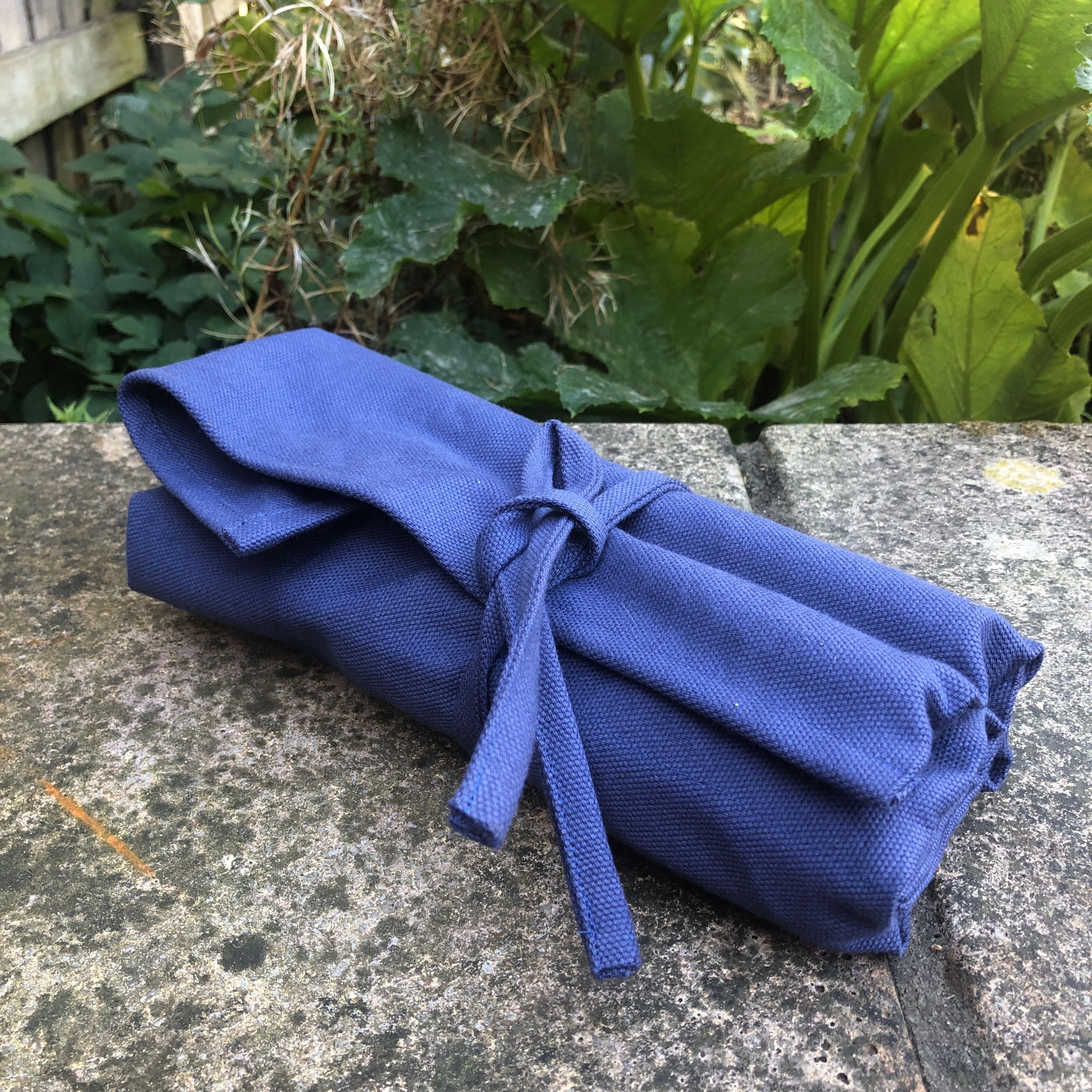 This tool roll is made from a heavy royal blue cotton canvas. It is machine washable.
